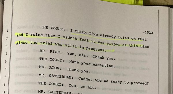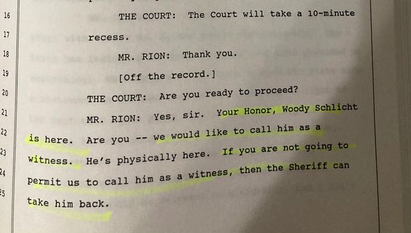 Trial transcript’s showing Judge McCracken denies Woody Schultz to testify.