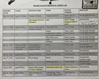 Miami Valley Crime lab ran tests from the drains, washing machine, and many other items. No DNA from Carrie was found.